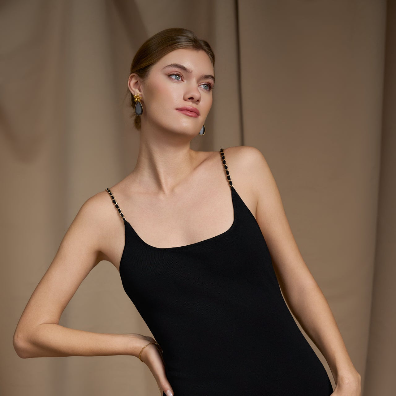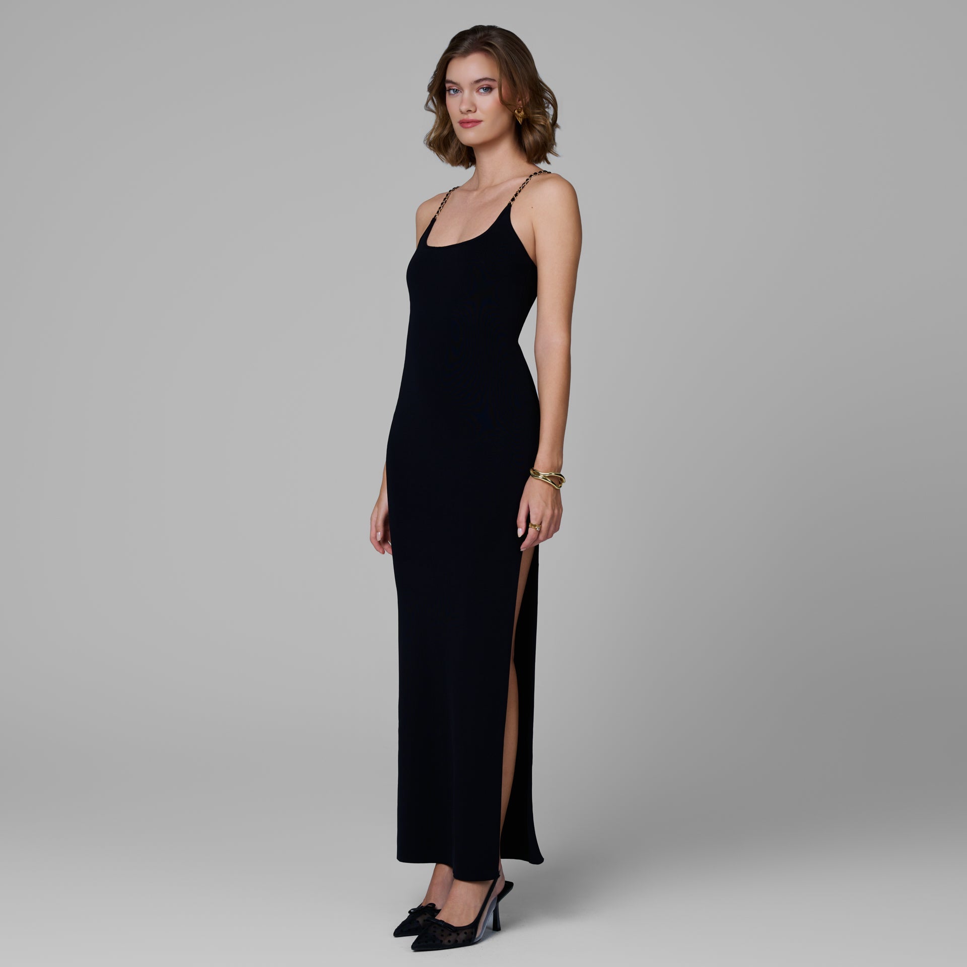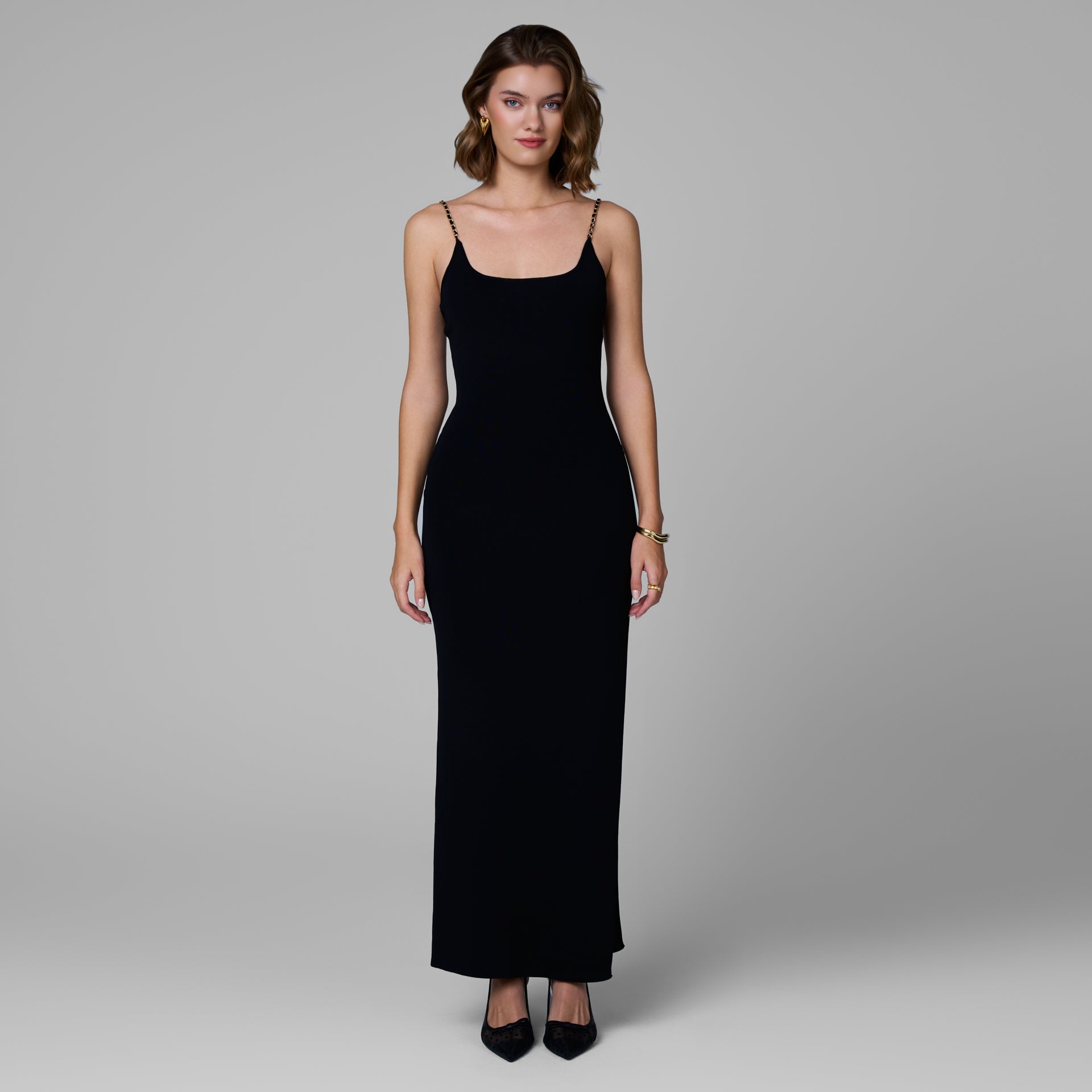 The Aurelia Knit Chain Dress is a sculpting silhouette crafted from a soft, body-hugging knit, this long dress contours the figure with effortless stretch and structure. It features a clean square neckline and delicate gold chain straps that add a touch of refined shine. Perfect for sunset dinners, evening soirées, or vacation nights, this piece transitions beautifully from resort to city.