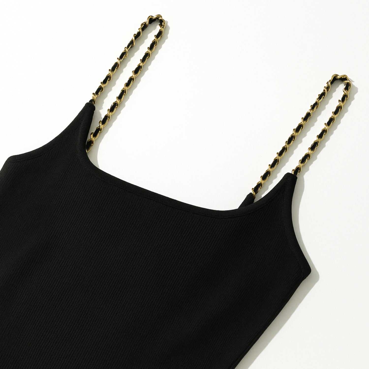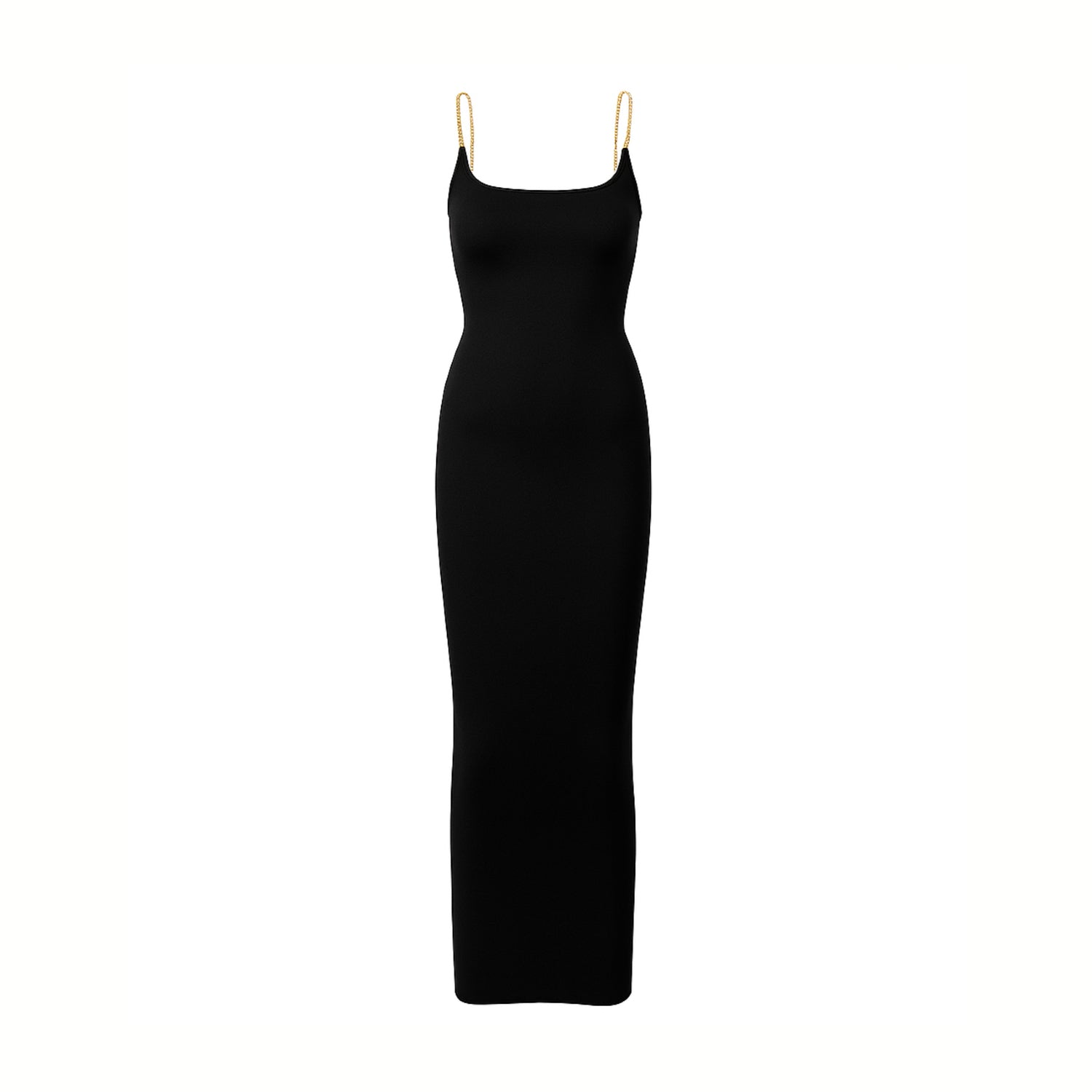 The Aurela Knit Chain Dress is a sculpting silhouette crafted from a soft, body-hugging knit, this long dress contours the figure with effortless stretch and structure. It features a clean square neckline and delicate gold chain straps that add a touch of refined shine. Perfect for sunset dinners, evening soirées, or vacation nights, this piece transitions beautifully from resort to city.