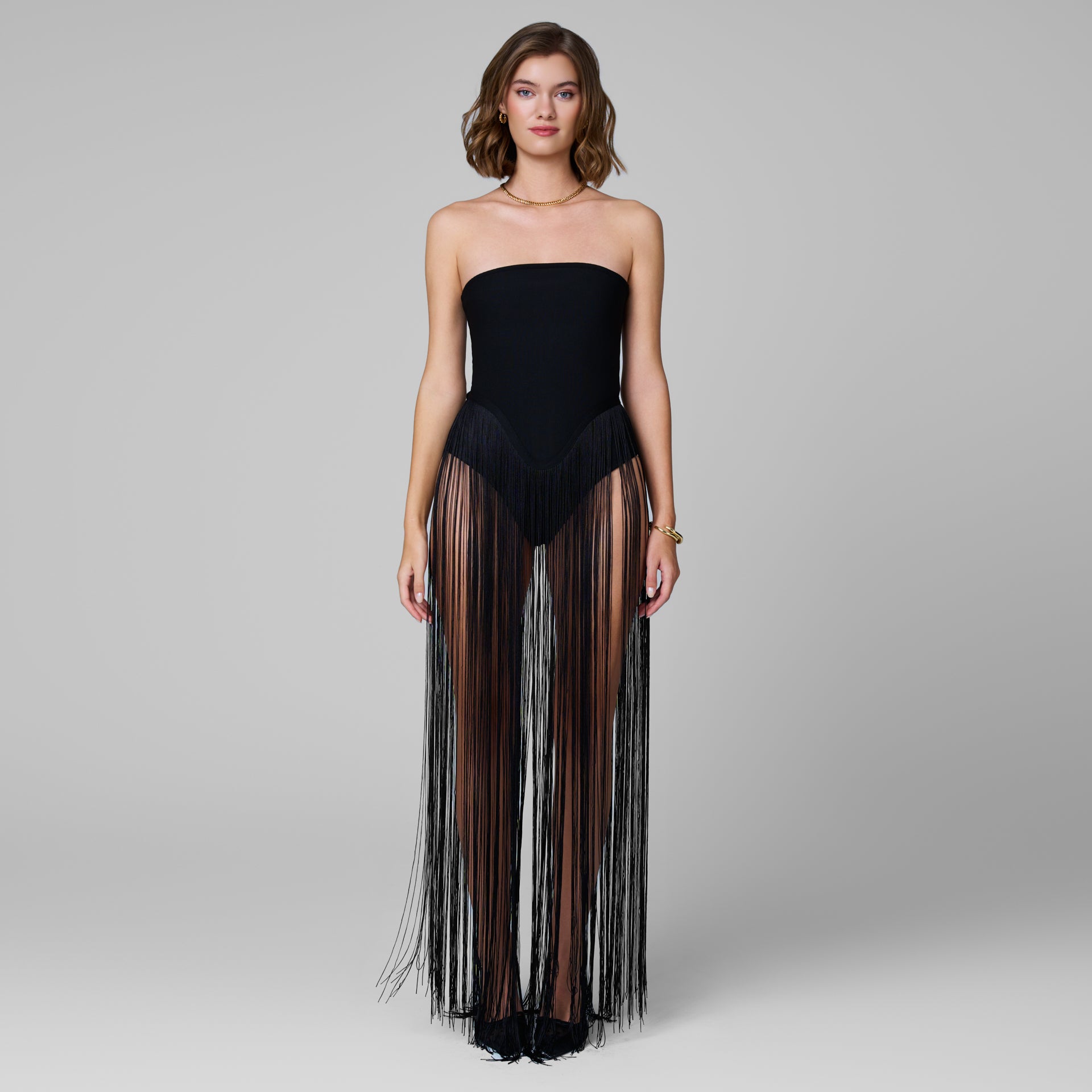 A show-stopping strapless bodysuit gown that moves as effortlessly as you do. Crafted in a knitted body-hugging bodice, floor-length fringe that sways with every step. The deep V-fringe placement elongates the silhouette, creating drama from every angle. Whether it’s a rooftop soirée, a festival runway moment, or a night of endless dancing, this piece isn’t just a dress—it’s an entrance.