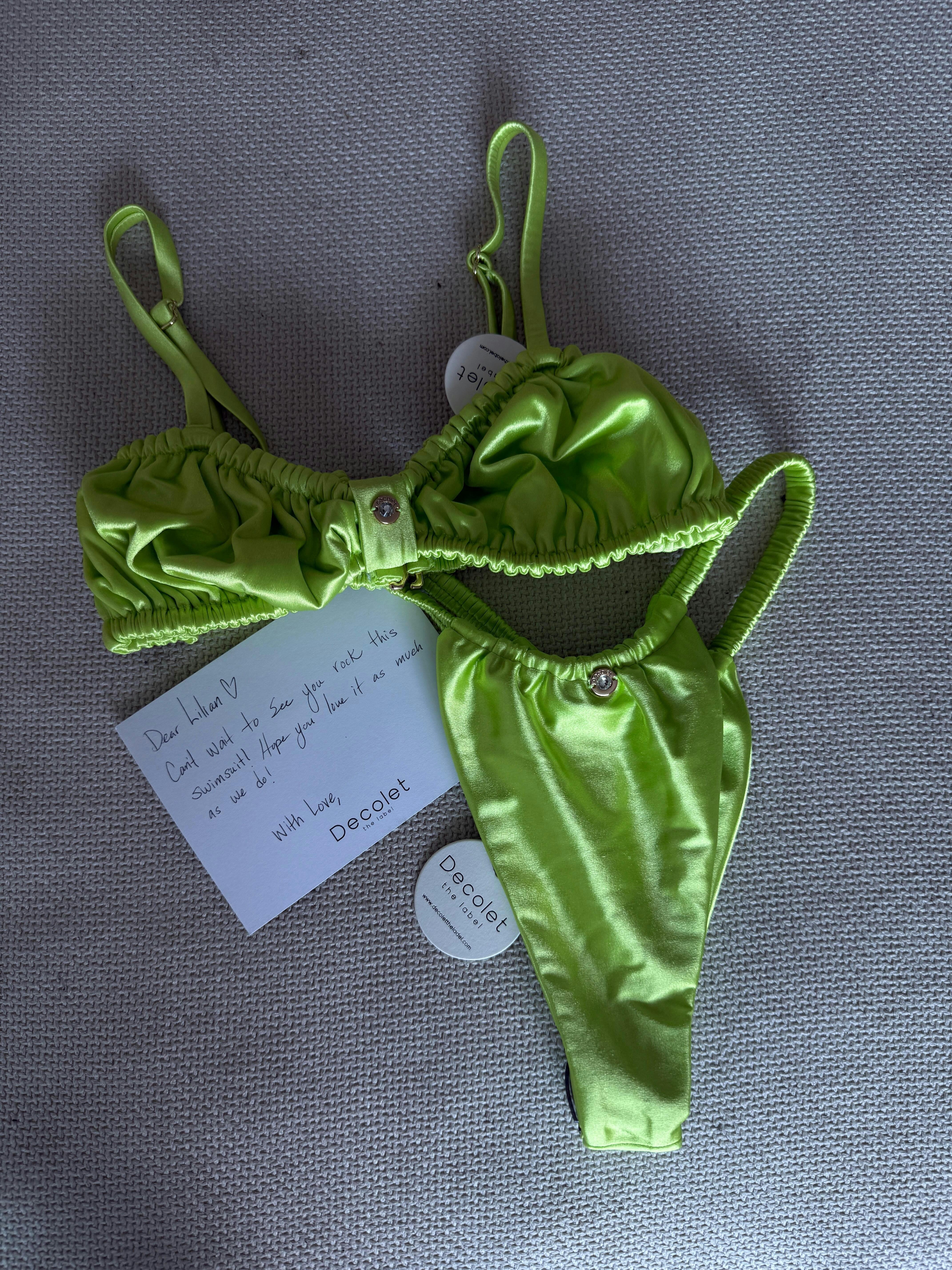I’m absolutely in love with this bathing suit set! The lime color is so vibrant and different. I’ve never seen anything quite like it, which makes it stand out beautifully. The fabric feels incredibly soft and you can tell it’s made from high-quality materials. One of my favorite things is how versatile the top is. I’ve paired it with jeans for a pool party, and it looked amazing! Highly recommend!