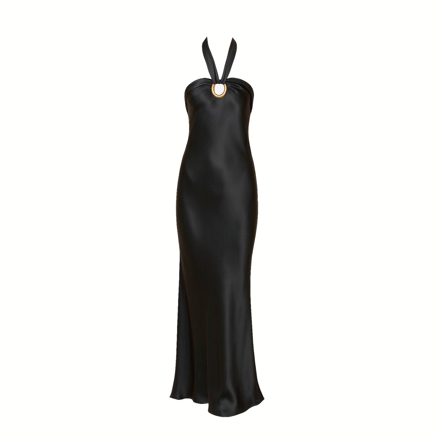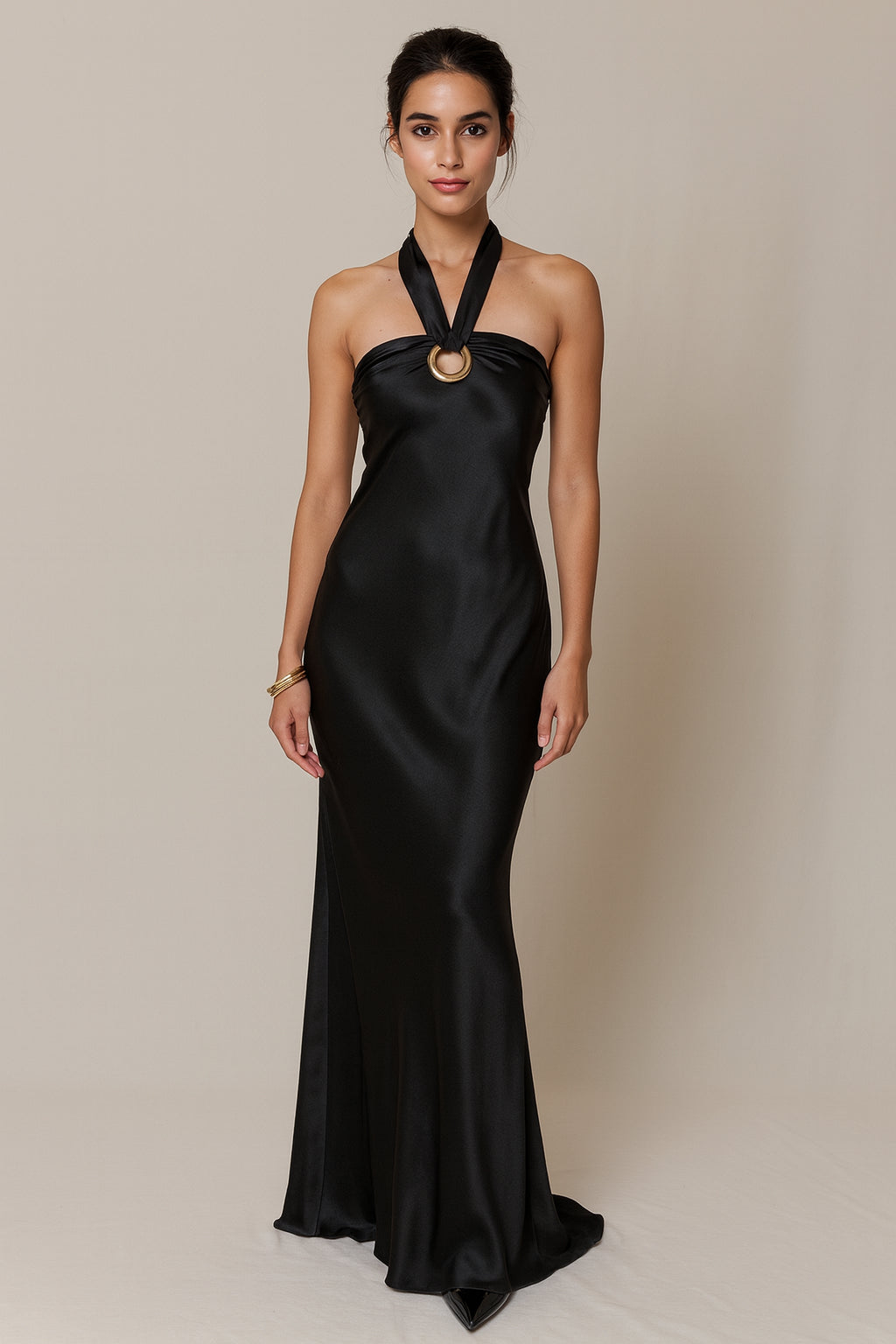 The Solene Satin O-Ring Dress is a timeless statement piece designed for elegant evenings and resort occasions. Crafted from luxurious satin with a fluid drape, this long halter gown features a striking gold O-ring detail. The versatile design allows it to be worn two ways — as a halter neck dress or styled as a strapless tube dress with the straps draped as a chic scarf detail. Effortless, sleek, and endlessly wearable, it’s the perfect piece for special events, vacations, or nights out.