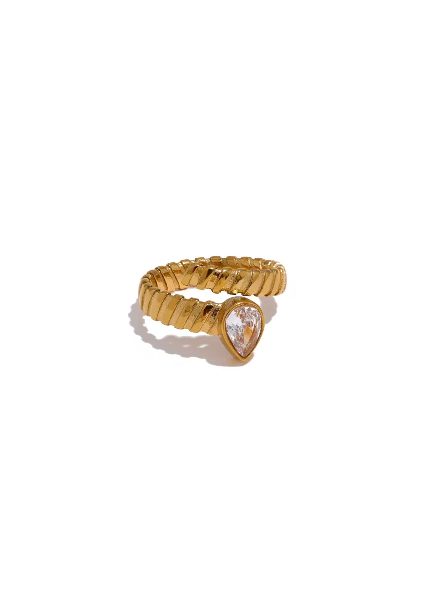 the Wraparound Teardrop Ring features a delicately textured gold band that wraps effortlessly around your finger. At its center, a captivating teardrop-shaped stone adds a touch of brilliance and sophistication. This adjustable design ensures a comfortable, personalized fit, making it perfect for any occasion. Wear it solo for a refined statement or stack it with your favorites to create a layered, radiant look.